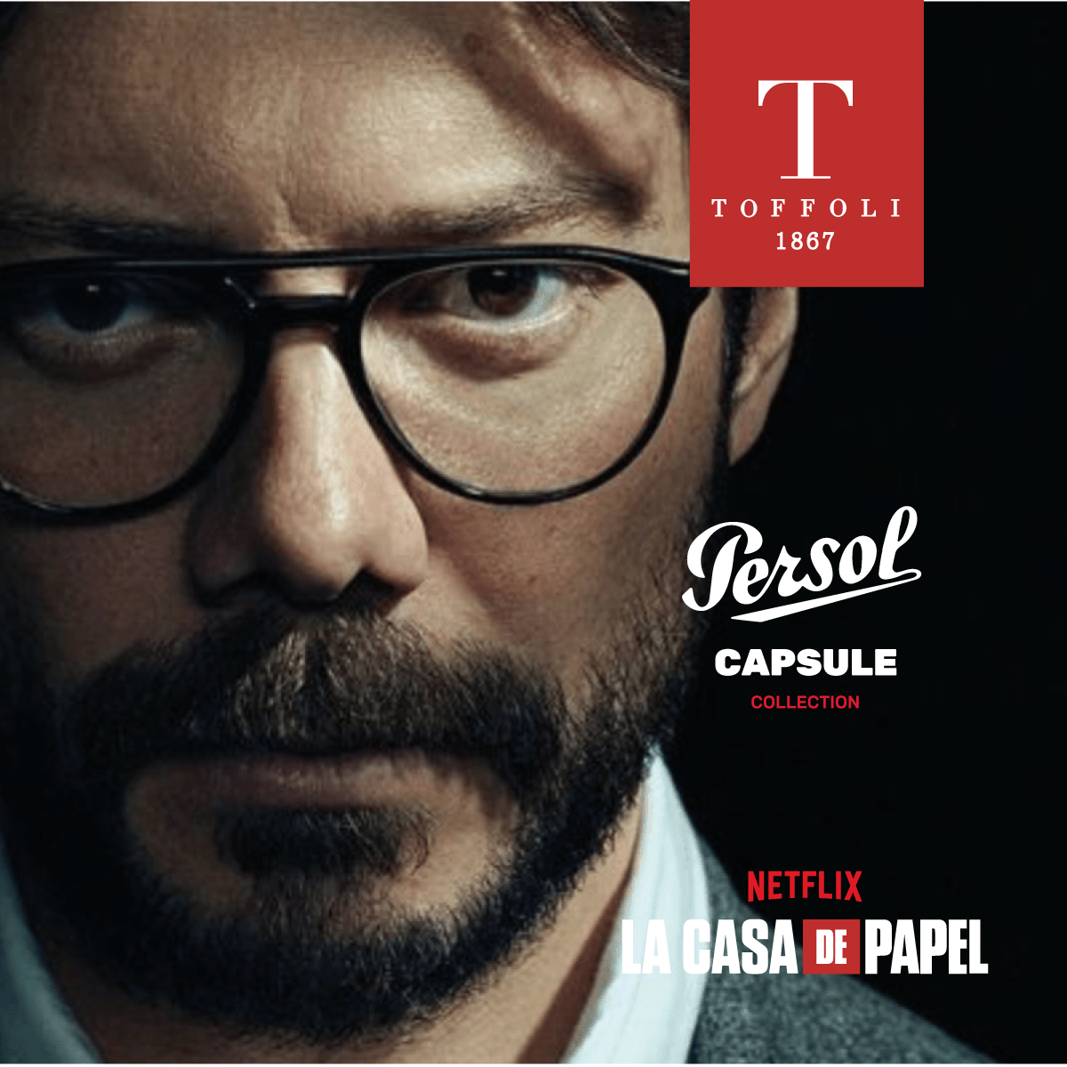 Persol ha lanciato in contemporanea una capsule collection ispirata al protagonista della popolare serie spagnola: il Professore. Sin dal primo episodio “El Profesor” si è distinto per i suoi Persol: l’iconico modello pilota dalle lenti unite tramite un leggero doppio ponte, elegante e senza tempo. Confortevole, grazie alla flessibilità del sistema Meflecto e ben saldo, merito del nasello accentuato che caratterizza le creazioni del marchio torinese fin dal 1917.la collezione è realizzata a mano, in Italia, e comprende sia modelli da sole che da vista, rispettivamente "El profesor Sergio" e "El profesor Original". Di Entrambe le versioni si può scegliere tra montatura nera e tartarugata nella sfumatura "caffe".